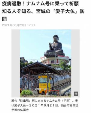 河北新報ONLINE NEWSで【疫病退散!ナムナム号に乗って祈願 知る人ぞ知る、宮城の「愛子大仏」訪問】と題して紹介されました